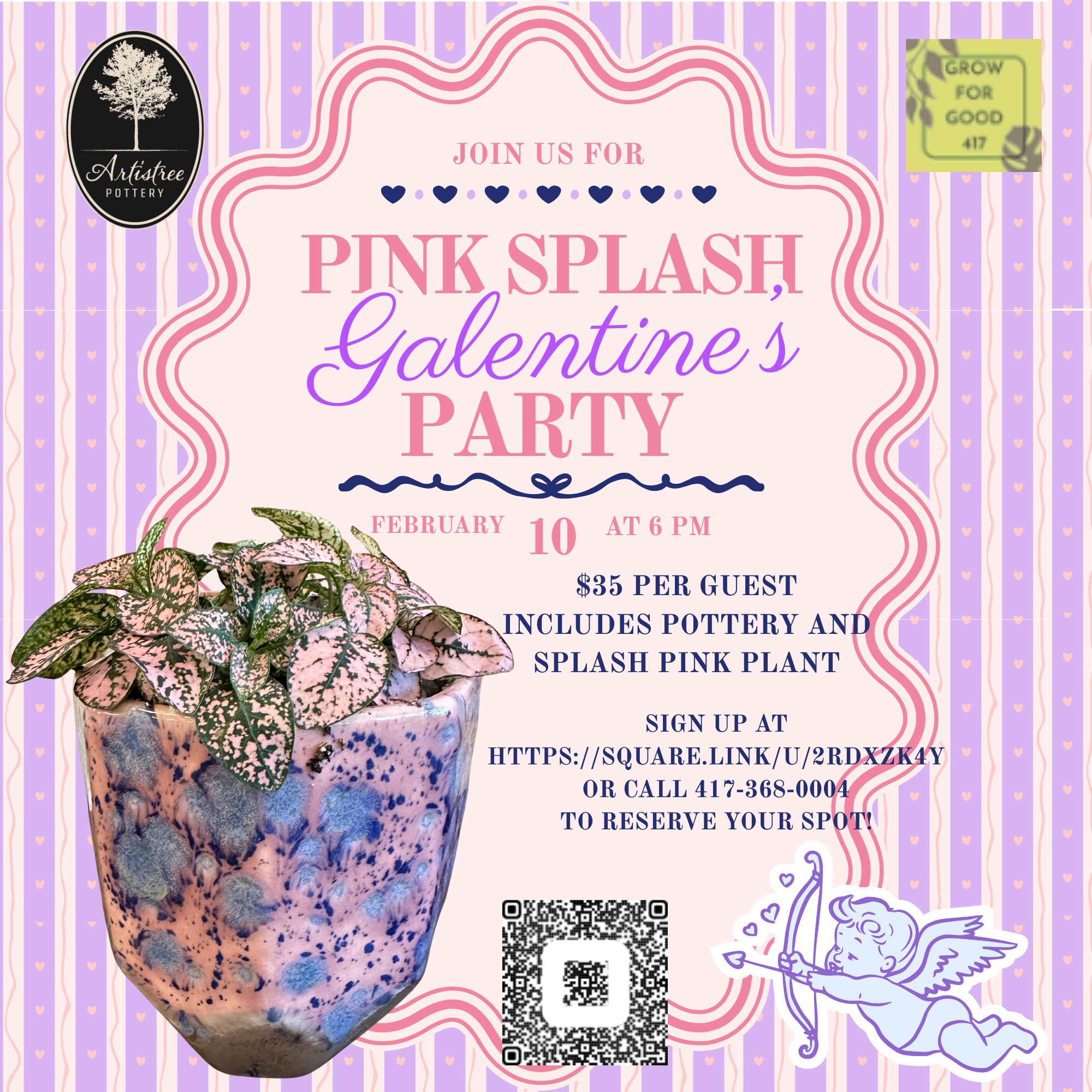 We're SO excited to announce our Galentine's Plant pARTy is happening on February 10th at 6 pm at Artistree Pottery! This event is open to everyone--Galentines, Valentines, and all plant lovers! This year's feature: The Pink Splash! Paint your own masterpiece, let Artistree kiln it to perfection, and pick it up a week later with your Pink Splash planted inside! Seats are limited. Reserve your spot today!